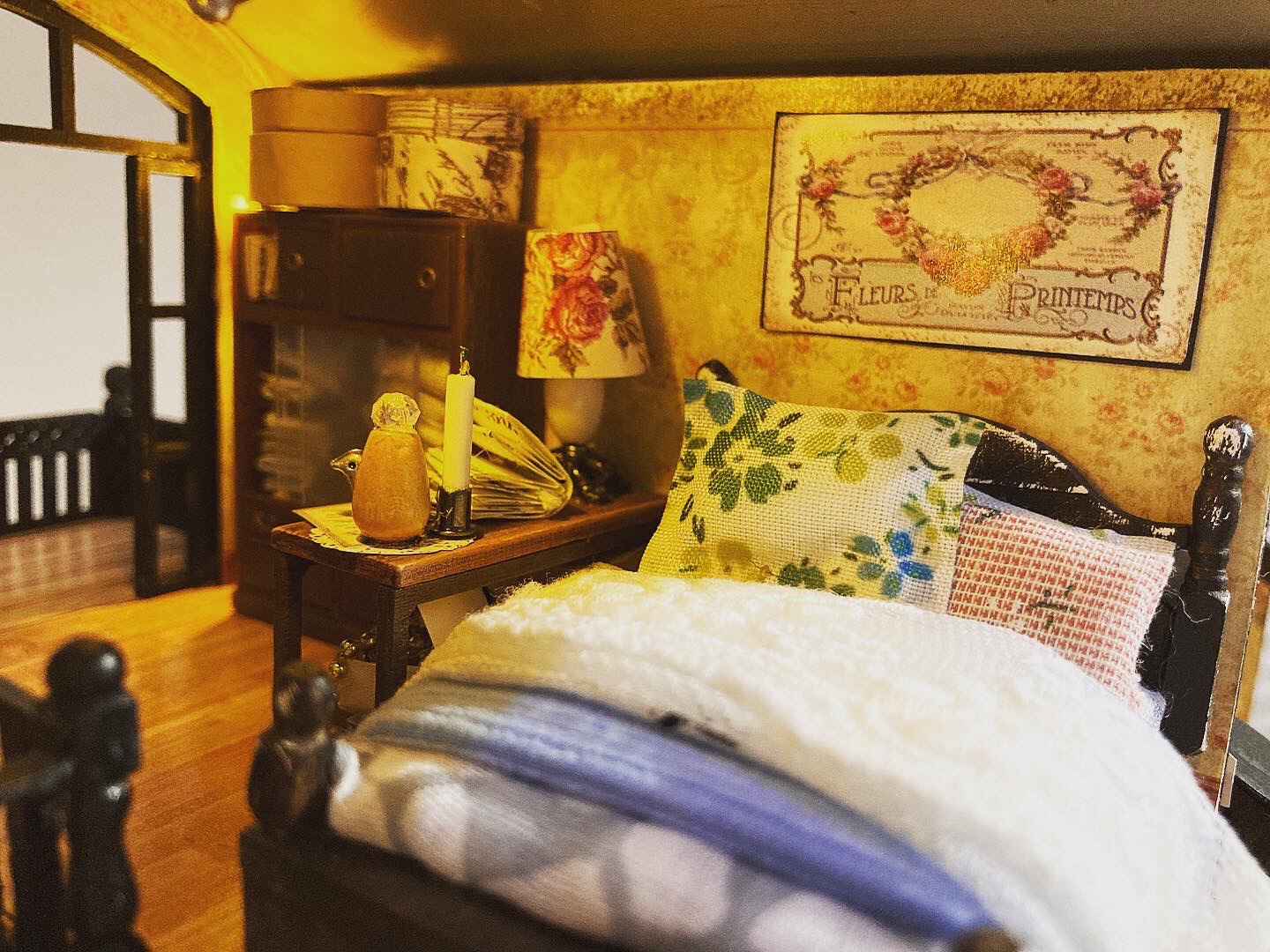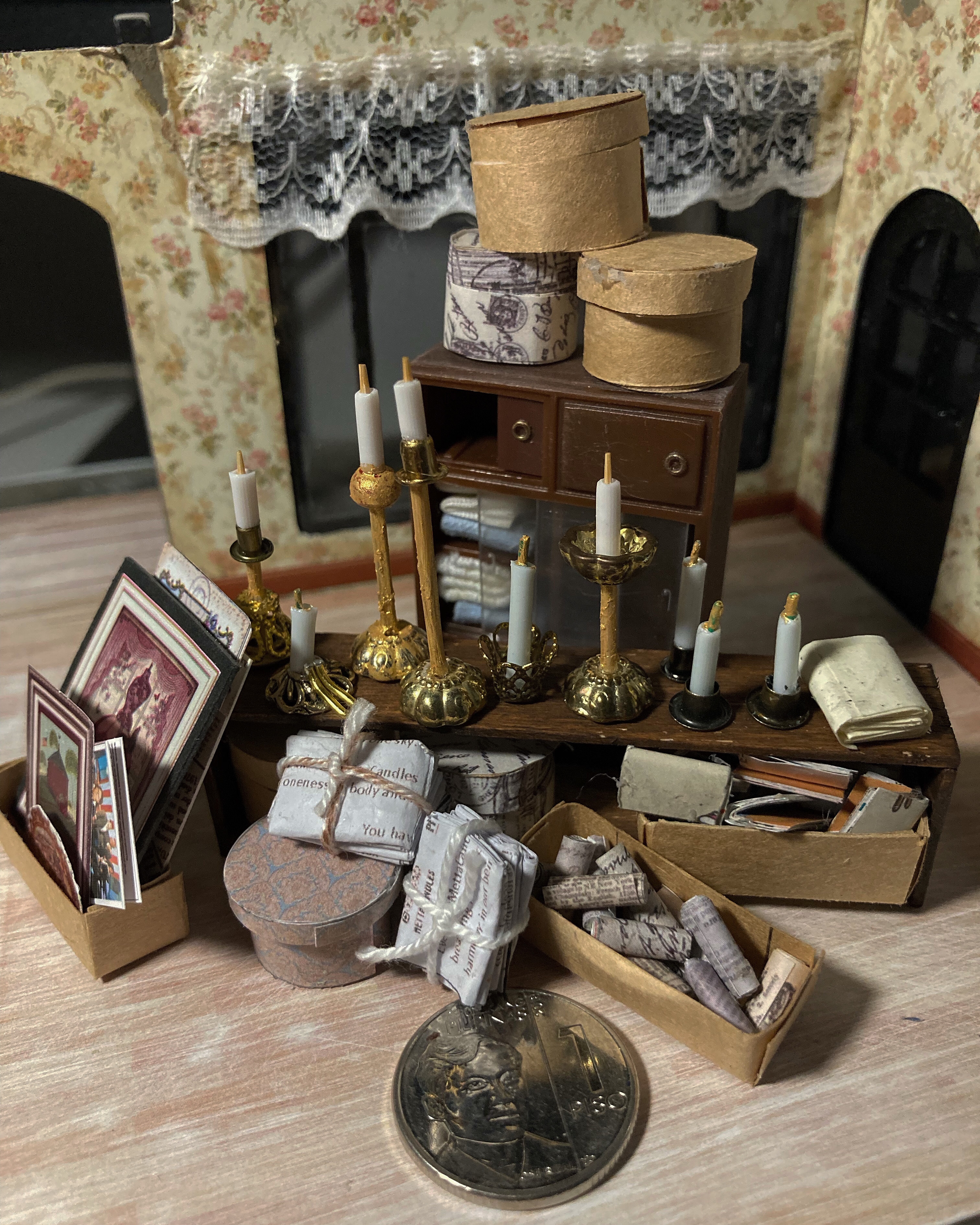 From there, it was easier to imagine the rest of grandma’s many tiny ephemera. I made itty-bitty vintage picture frames, candle holders, hat boxes, old books, rolled papers and tied up ones, boxes of old magazines and cloths, all these tiny hoarder shit. I weathered down furniture and walls and roofs, fashioned a bird cage and a broomstick, and styled her cozy bed. I also made a yellow winged chair for her as well, so she can watch black & white films from her tv. With this build, I had learned a bunch of tips and tricks to making mini things.