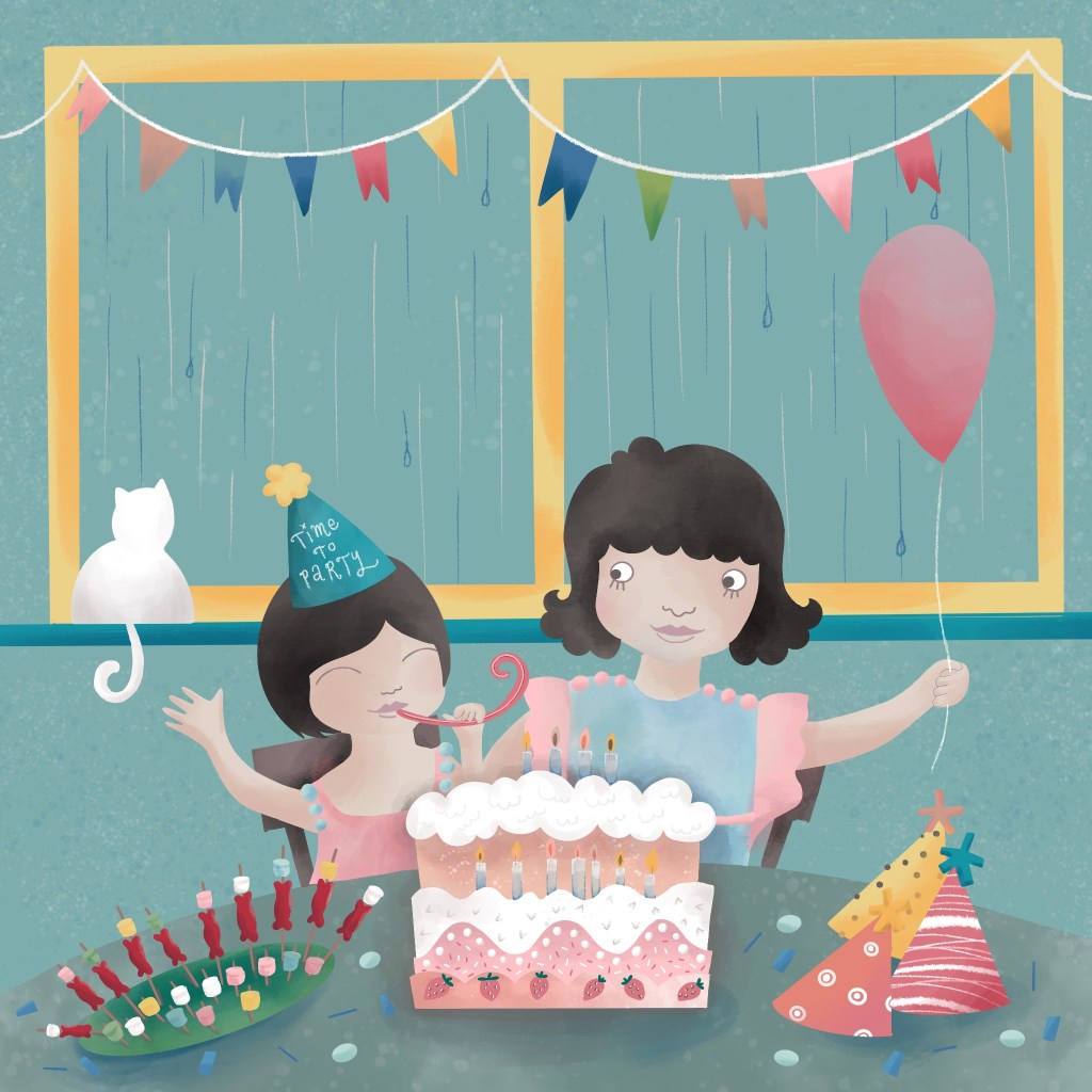 My sister and I celebrate the same birthday, and it had always been rainy occasions, but of course, there was always cake and skewered hotdogs and party hats which our Mama made.